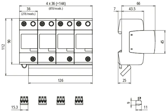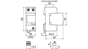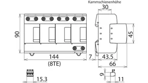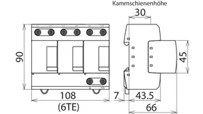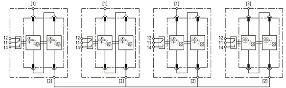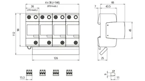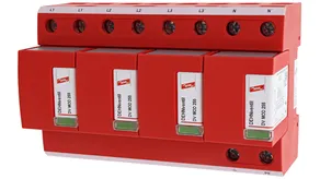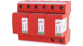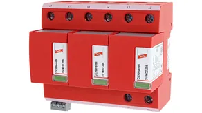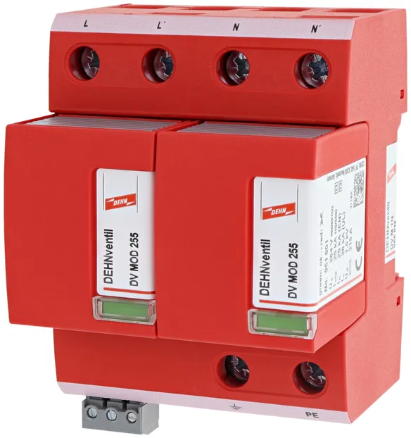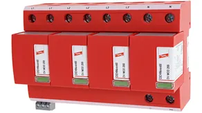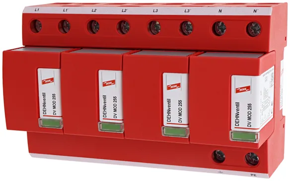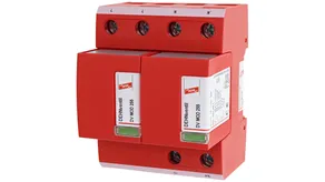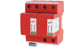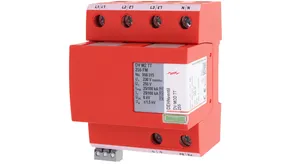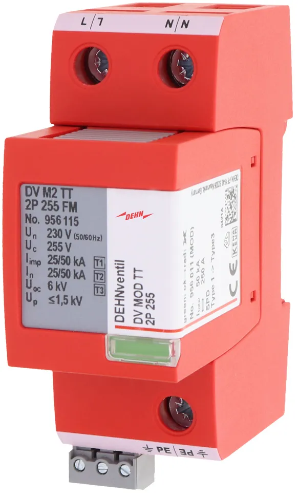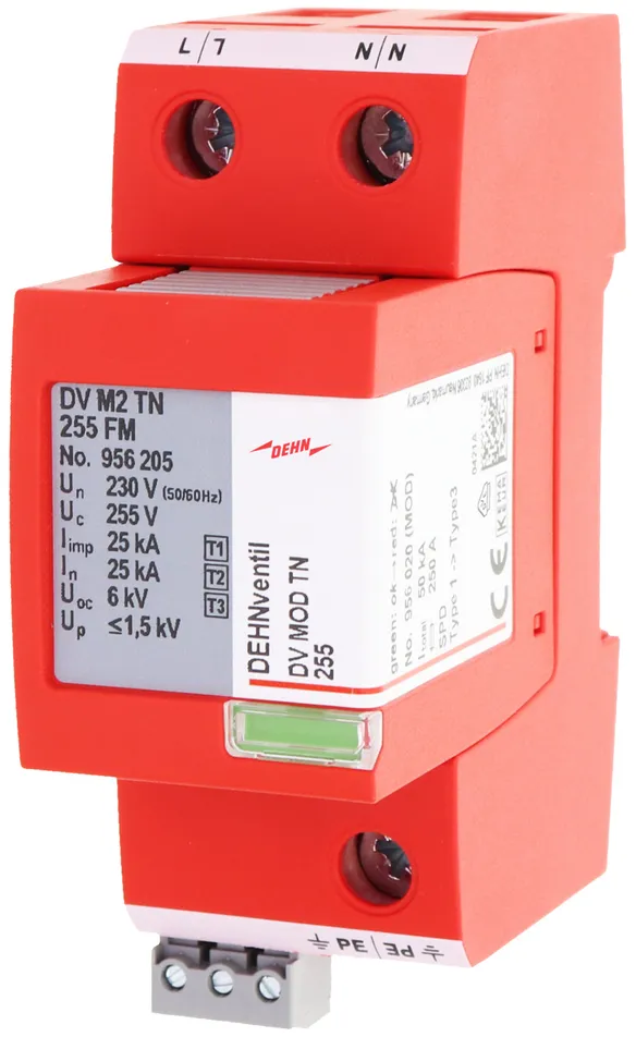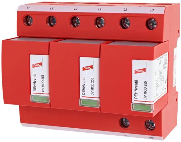 - ベース部と 1 個のプラグ式保護モジュールで構成された、スパークギャップベースの、すぐに配線可能な複合式避雷器タイプ 1 + タイプ 2 + タイプ 3