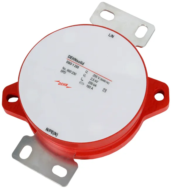 協調型雷電流避雷器 DEHNsolid 1 255 雷電流放電容量に関する最高要件を満たす 単極協調型雷電流避雷器 EN 61643-11 による避雷器タイプ 1の分類 バスバーへの取付けまたは取付けプレートへの取付けに 適したガスを 放出しない非常に堅牢な設計 連続最高電圧:255 V ac 保護レベル:<= 2.5 kV 雷インパルス電流 (10/350):200 kA フォロー電流消弧能力:3 kAeff 寸法:200 x 186 x 52 mm