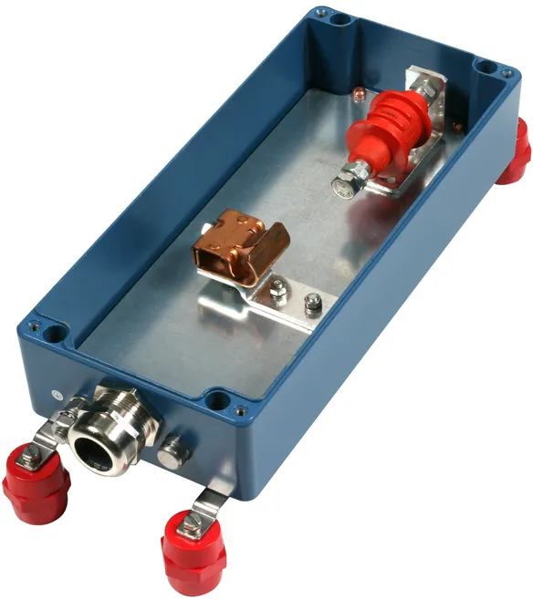 IEC 62561-3:2011(81/387/CDV) / EN 62561-3 に準拠した、一体型防爆絶縁スパークギャップ EXFS 100 内蔵の接続ボックス。絶縁継手および絶縁フランジへの同軸接続用。 防爆マーク付き防爆絶縁スパークギャップは以下に準拠します: IEC / EN 60079: Gase II 2G Ex d IIC T6 IEC / EN 61241:防塵 II 2D Ex tD A21 IP67 T 80°C 雷インパルス電流 (10/350):100 kA IEC 62561-3:2011 に準拠した耐雷電流クラス (81/387/CDV) / EN 50 164-3: H 公称放電電流 (8/20):100 kA 定格インパルス応答電圧:<= 1.25 kV 応答交流電圧 (50Hz):<= 0.5 kV 定格電源周波数耐電圧 (50 Hz):<= 250 V 定格放電電流 (50 Hz):500 A / 0.2 秒(Tu <= 45°C) 保護等級:IP67 接続用ハウジング:接続ネジ M10 x 25 と スプリングワッシャー、シールド接続端子付き